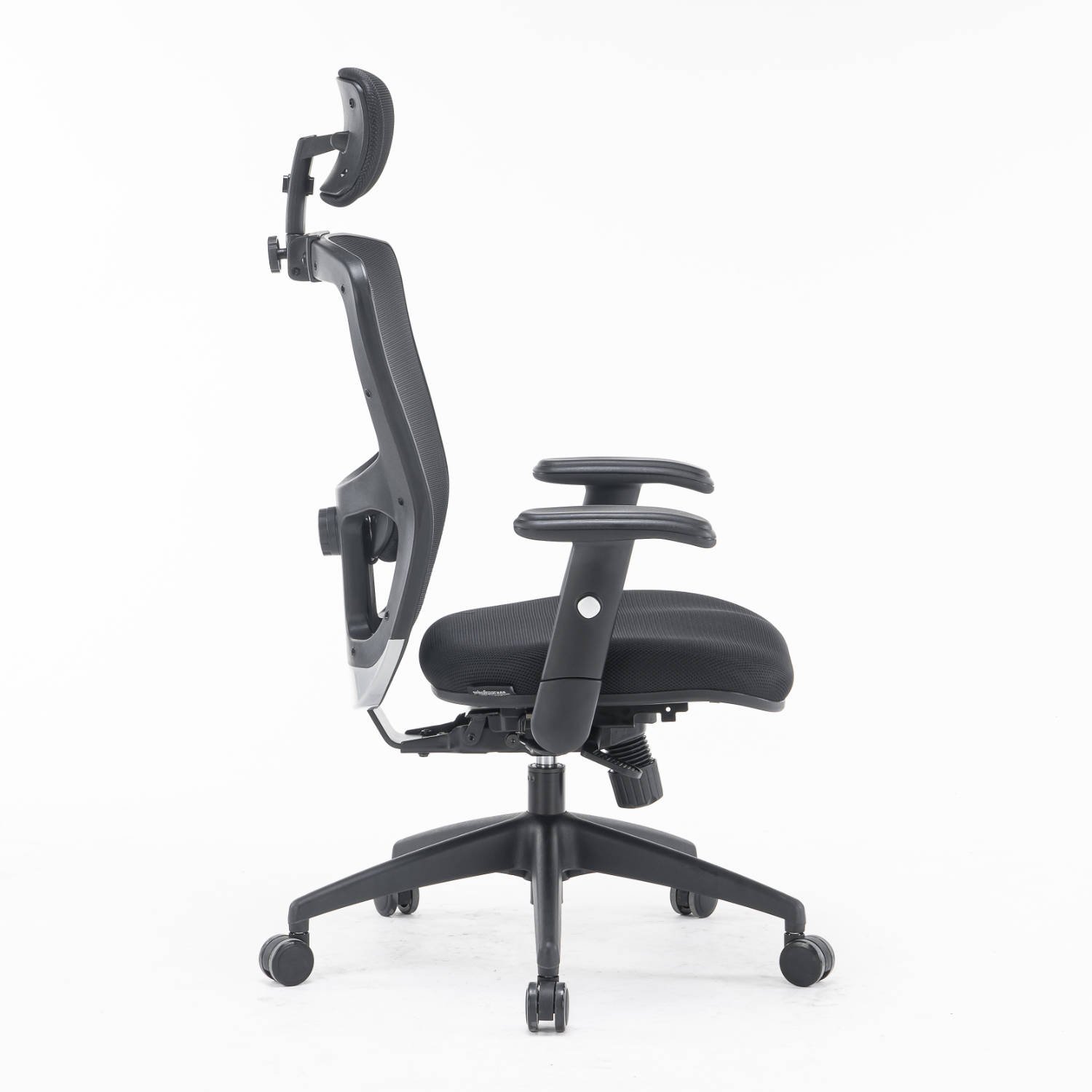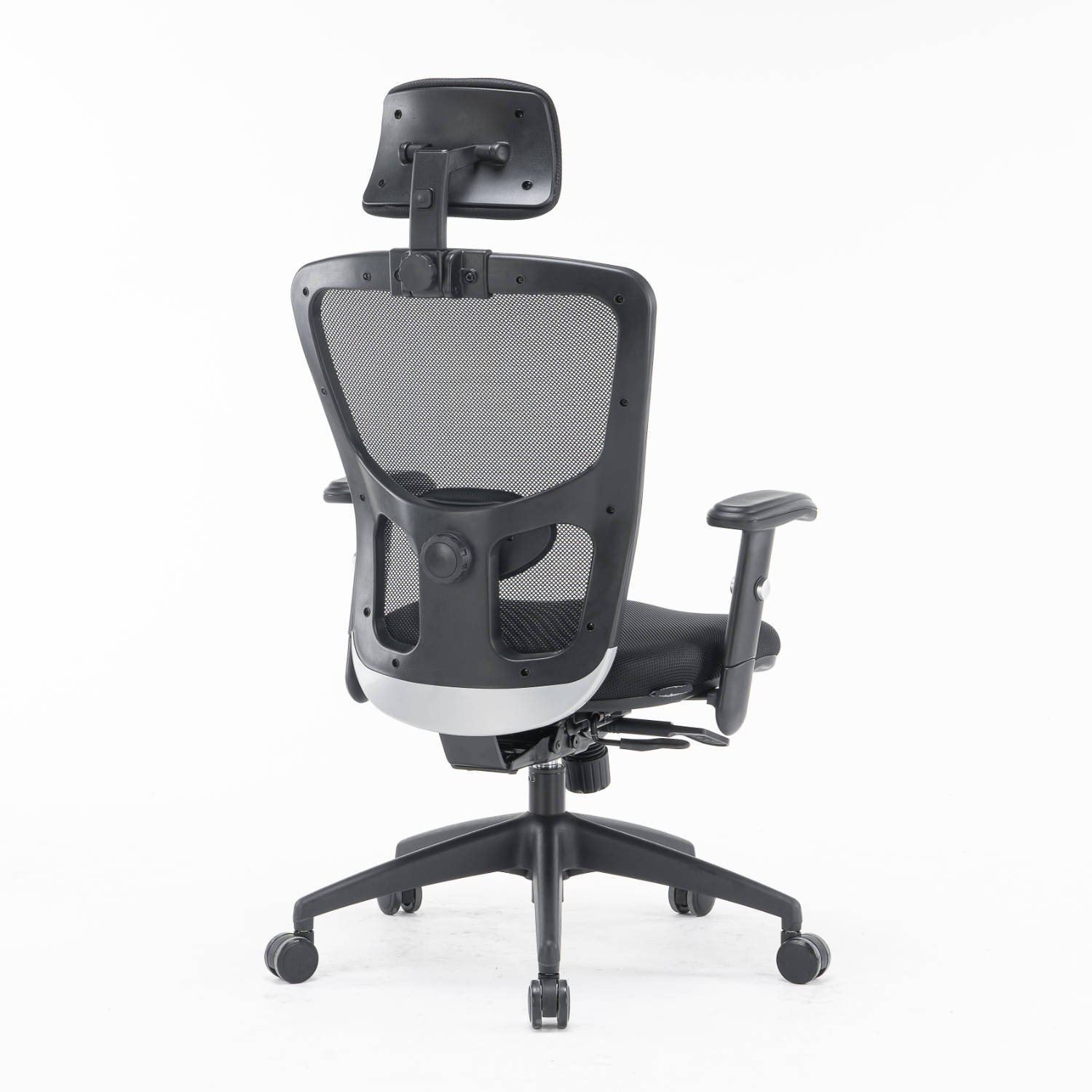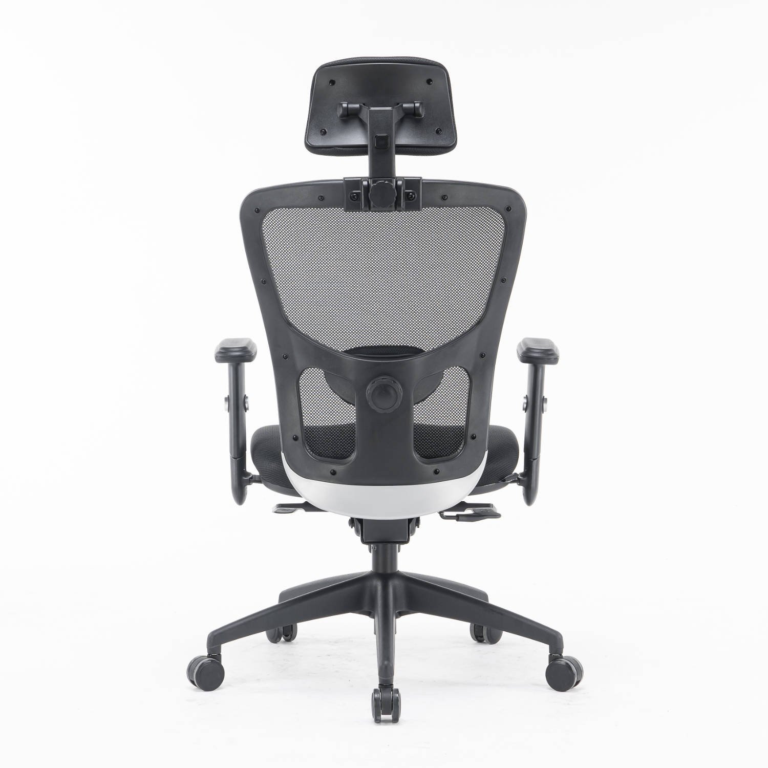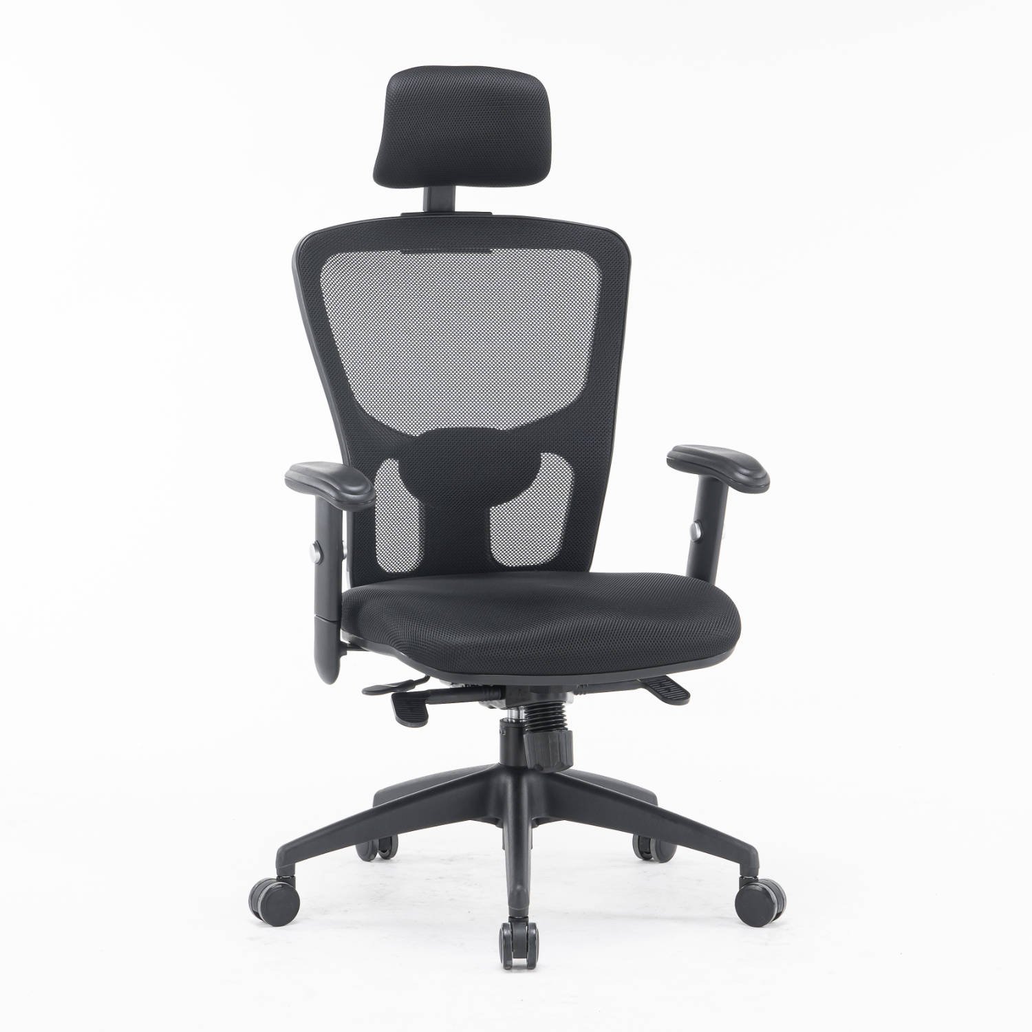 Struttura in polipropilene nero Razza nera in nylon con ruote piroettanti nere in PU Sistema di elevazione a gas per la regolazione del sedile in altezza Manopola per la regolazione di tensione per il peso del corpo Seduta ampia e sagomata in schiuma ad alta densità, rivestita in tessuto imbottito nero e regolabile in profondità Schienale regolabile in più posizioni, rivestito in rete tecnica traspirante nera con poggiatesta in tessuto imbottito e supporto lombare neri regolabili Meccanismo SYNCRO Braccioli neri in morbido PU regolabili in altezza Dimensioni: cm 66 x 68 x h. 120/130 Certificazione: UNI EN1335 1-2 Colore: nero
